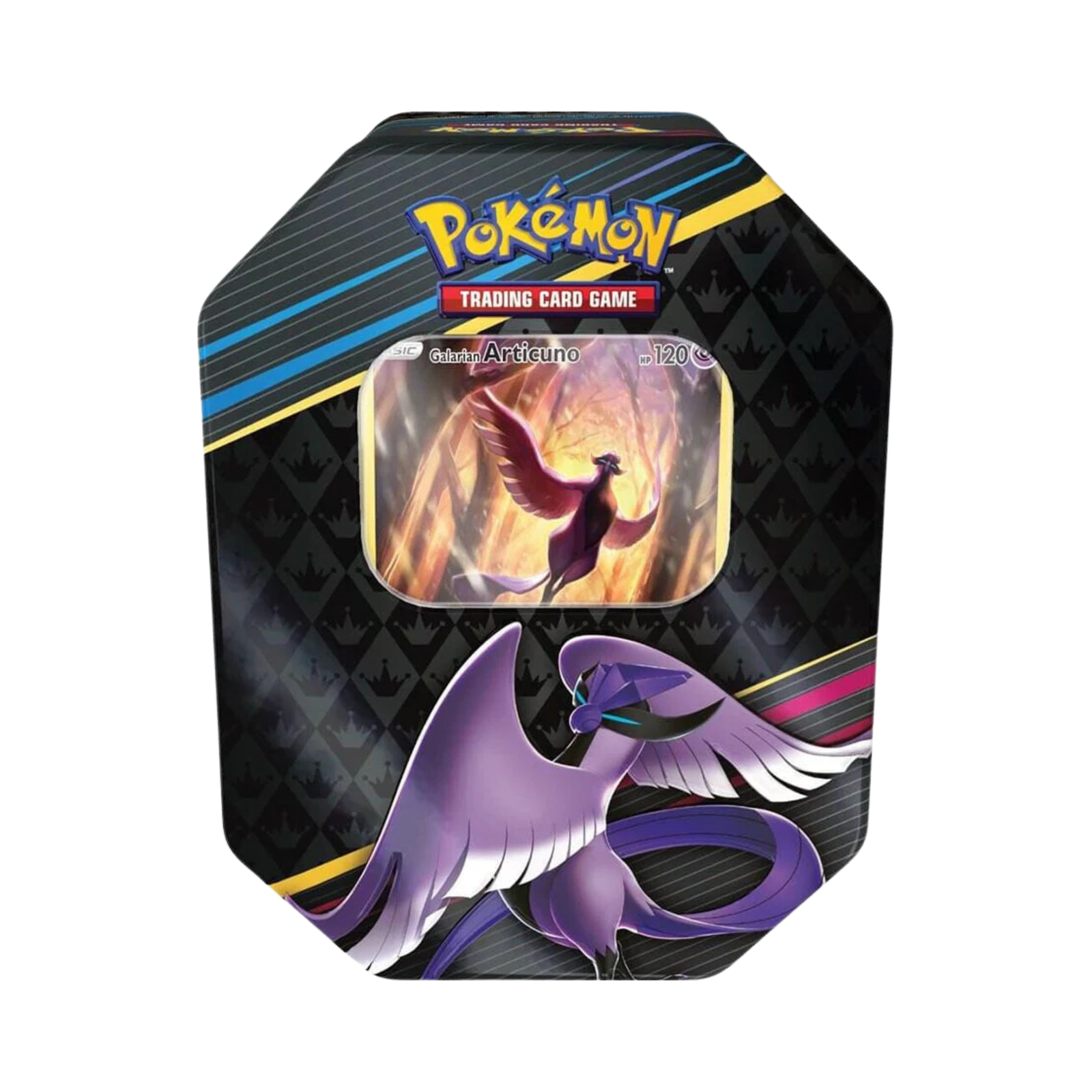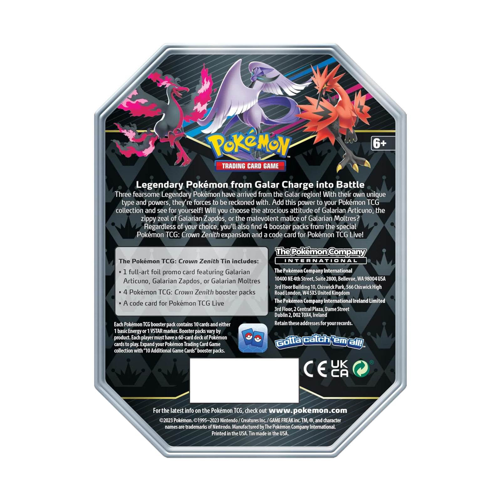 Legendary Pokémon from Galar Charge into Battle! Add the atrocious atude of Galarian Articuno to your Pokémon TCG collection! This tin featuring Galarian Articuno includes 1 full-art foil promo card and 4 Pokémon TCG: Crown Zenith booster packs. Also includes a code card for Pokémon Trading Card Game Live.