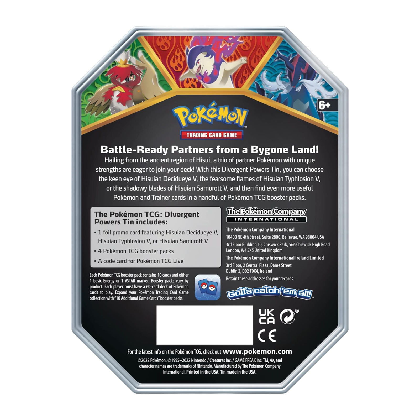 Battle-Ready Partners from a Bygone Land! Hailing from the ancient region of Hisui, a trio of partner Pokémon with unique strengths are eager to join your deck! This tin featuring Hisuian Decidueye V includes 1 foil card featuring Hisuian Decidueye V and 4 Pokémon TCG booster packs. Also includes, a code card for Pokémon Trading Card Game Live.
