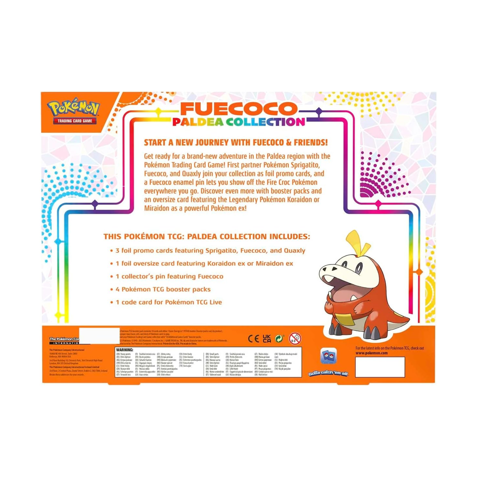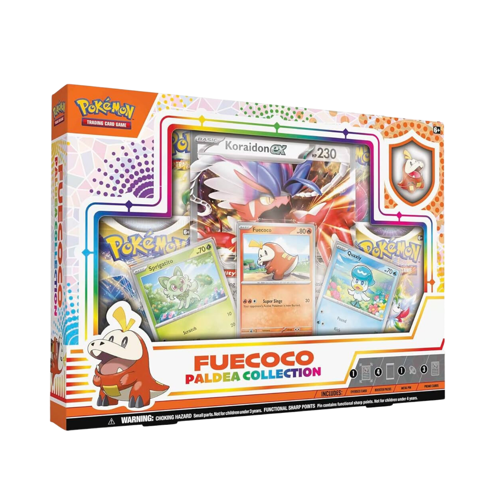 Get ready for a brand-new adventure in the Paldea region with the Pokémon Trading Card Game! First partner Pokémon Sprigatito, Fuecoco, and Quaxly join your collection as foil promo cards, and a Fuecoco enamel pin lets you show off the Fire Croc Pokémon everywhere you go. Discover even more with booster packs and an oversize card featuring the Legendary Pokémon Koraidon or Miraidon as a powerful Pokémon ex!