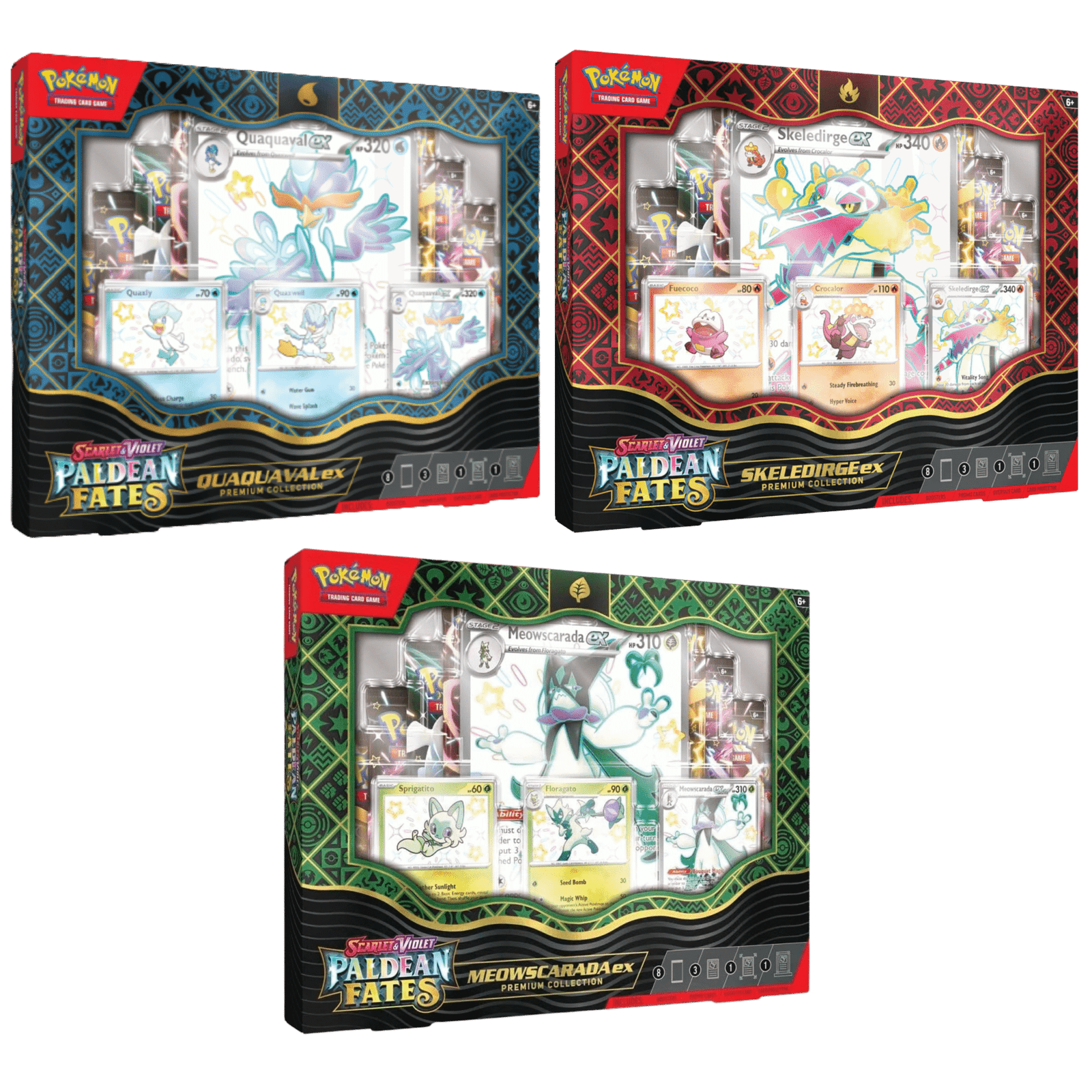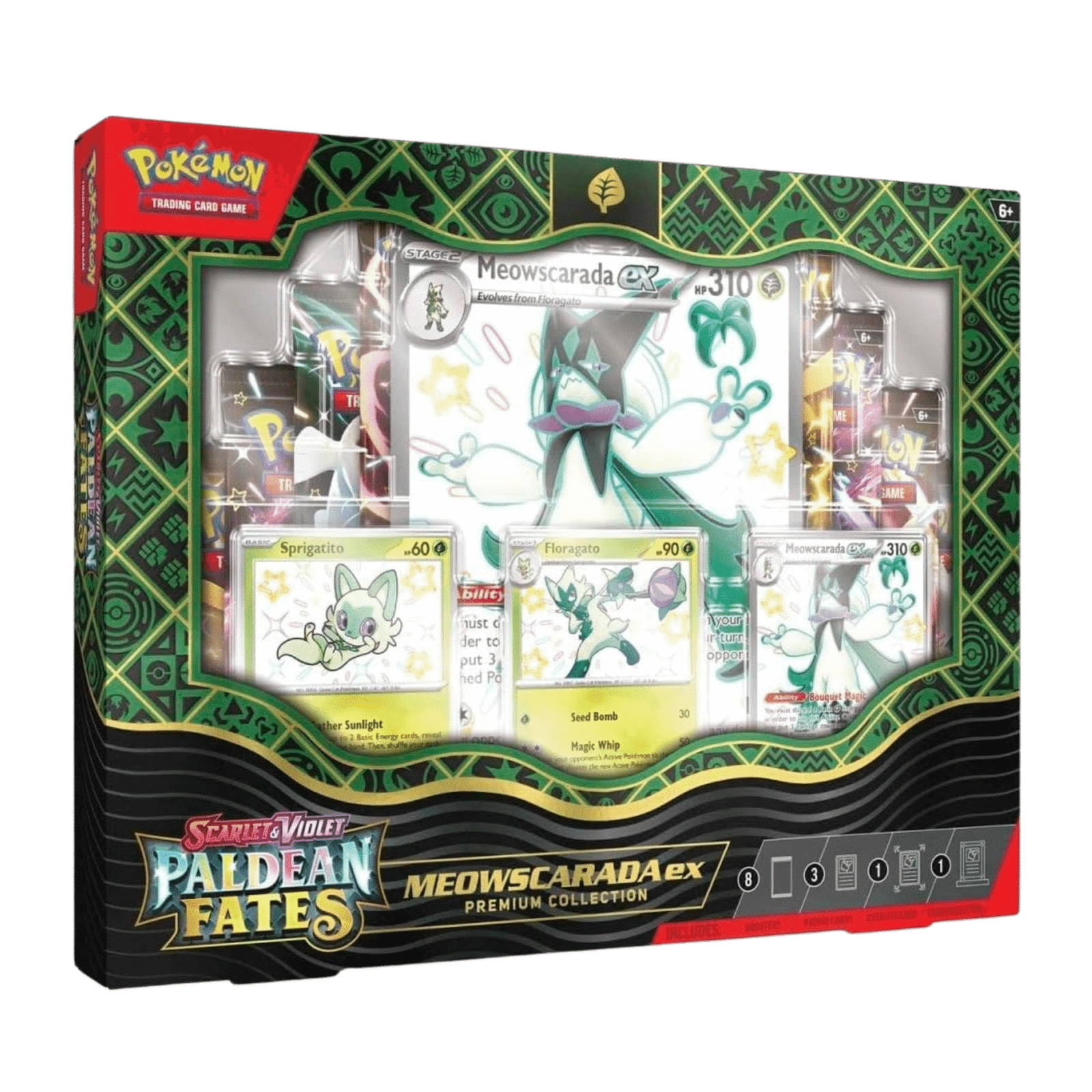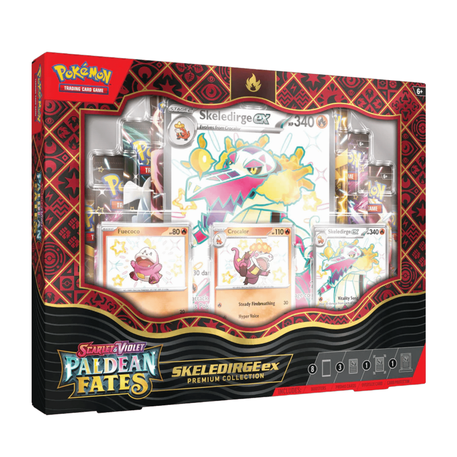 Enter the spotlight with the Pokémon TCG: Scarlet & Violet – Paldean Fates Premium Collection, a stunning tribute to the final evolutions of Paldea’s beloved starter Pokémon: Meowscarada, Skeledirge, and Quaquaval. Each Premium Collection is centered around one of these fully evolved stars—offering Trainers a fierce foil lineup, six booster packs from the Paldean Fates subset, and collectible extras that shine just as bright as their featured Pokémon.