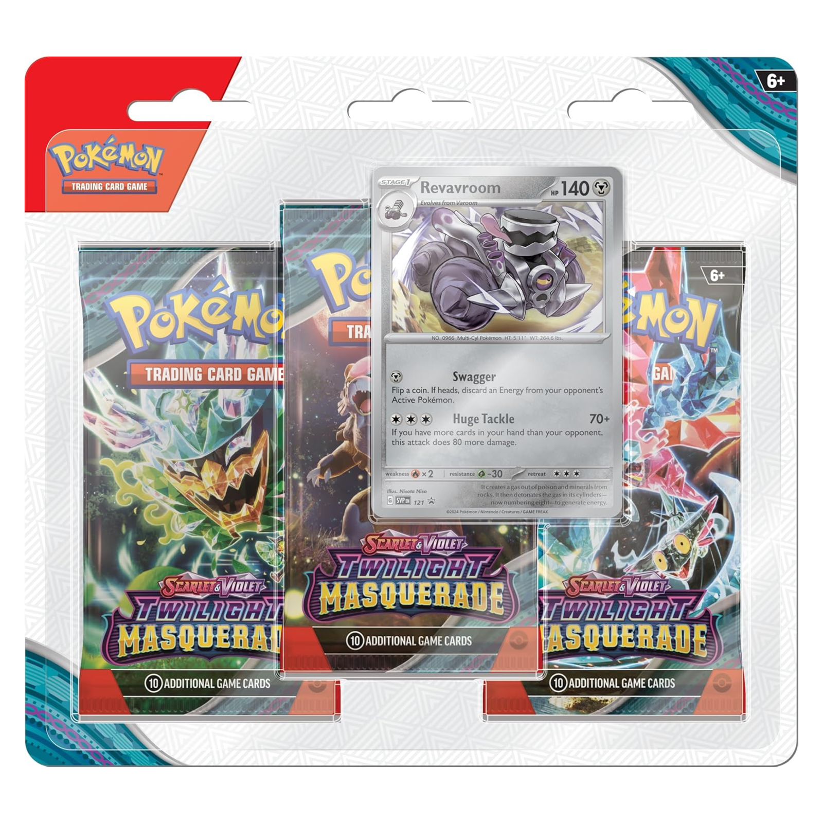 Dive into the world of masked enchantment, mysterious legends, and ancient Pokémon lore with the Pokémon TCG: Scarlet & Violet – Twilight Masquerade expansion. This 3-Pack Blister is a fan-favorite format that not only gives you three exciting chances to pull powerful and rare cards from SV06 but also comes bundled with an exclusive foil Revavroom promo card and a collectible metallic coin.
