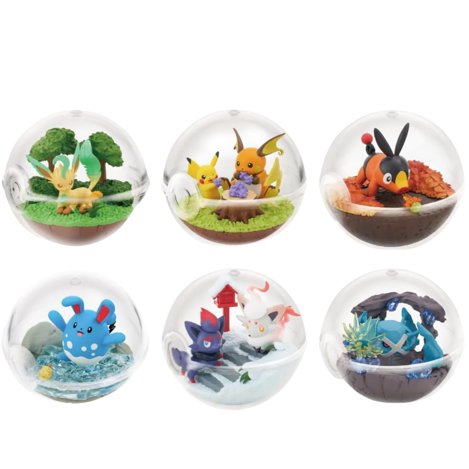 The Terrarium Collection by Re-Ment is one of their longest-running and most treasured lines. Instead of traditional figurines, this series places Pokémon inside spherical “terrariums” that resemble small clear Poké Balls, each containing a miniature setting that reflects the environment and personality of the featured Pokémon.