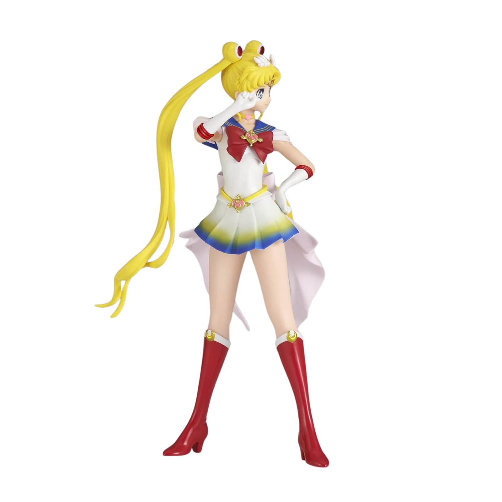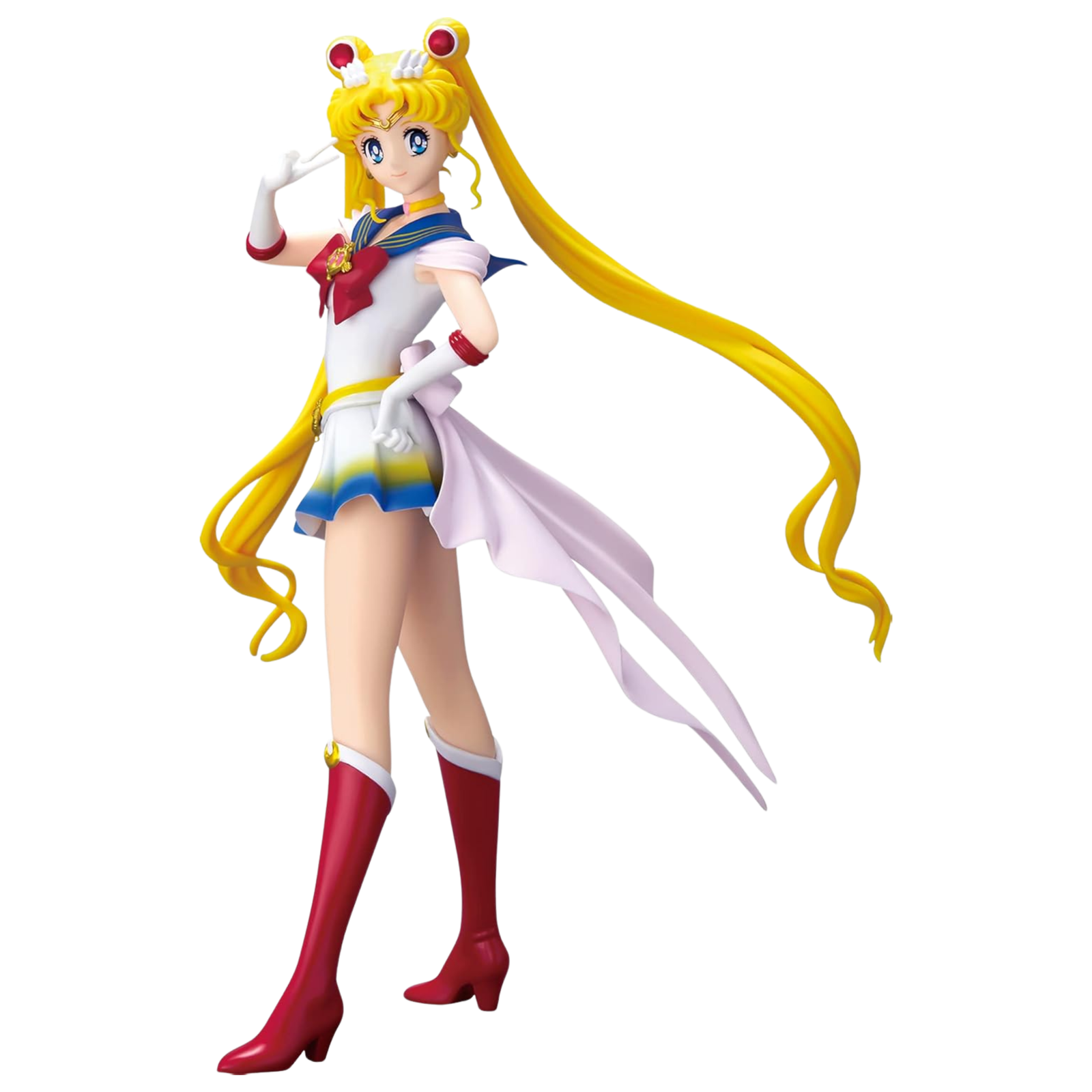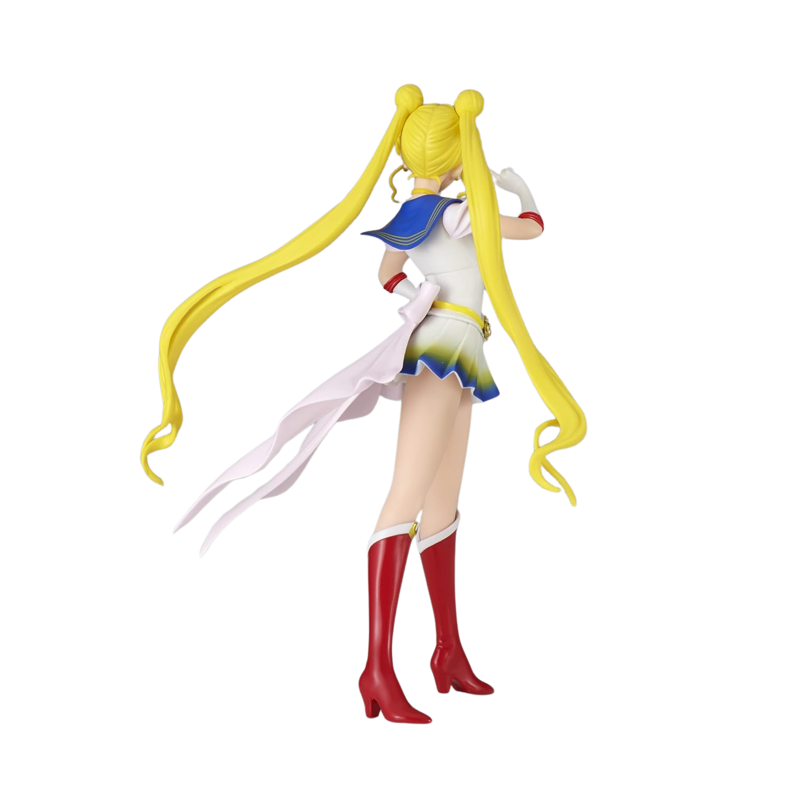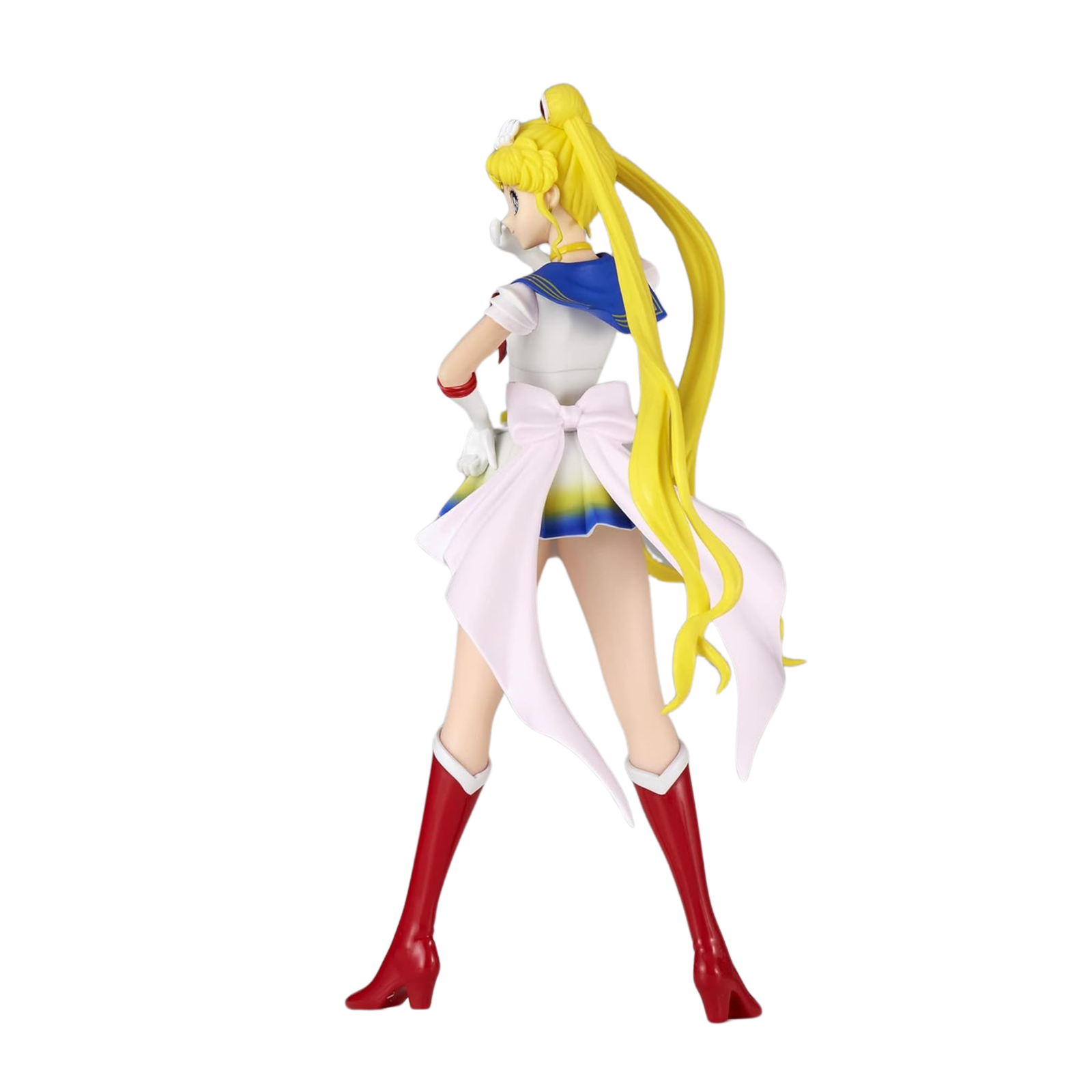 The Glitter & Glamours line by Banpresto is renowned for its sophisticated aesthetic and smooth, luxurious finish—and this Sailor Moon release is no exception. Her outfit is adorned with a gentle pearlescent sheen that reflects light beautifully, highlighting her elegance. The coloring is vivid yet soft, true to the romantic tones of the Sailor Moon Eternal movie. From the soft pink and blue hues of her collar to the crisp white of her boots and gloves, everything is harmoniously balanced to capture her delicate strength.