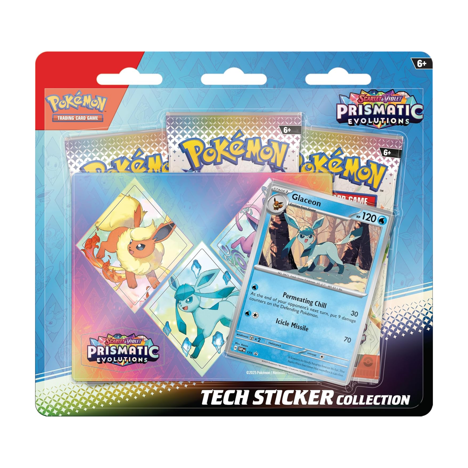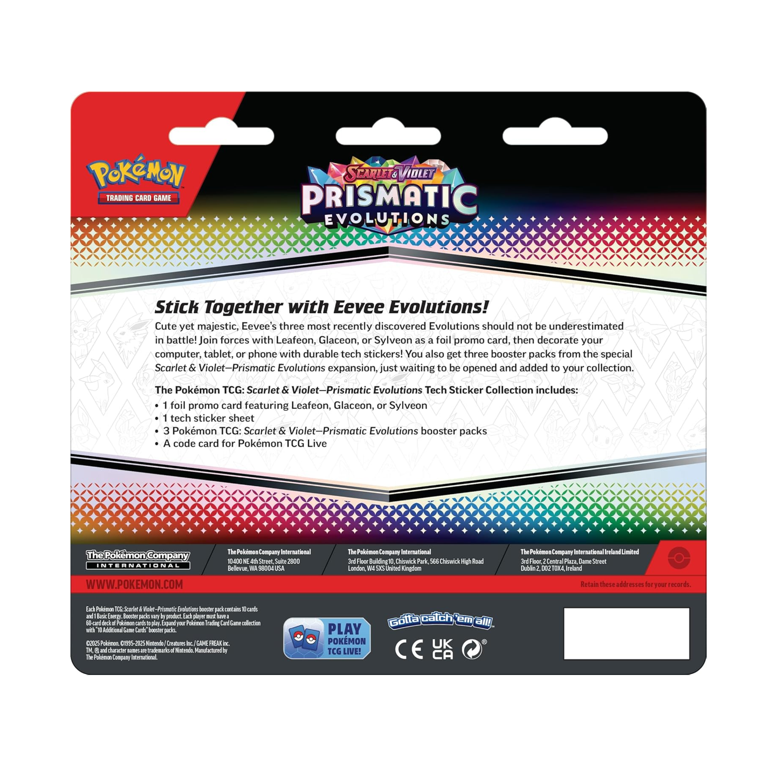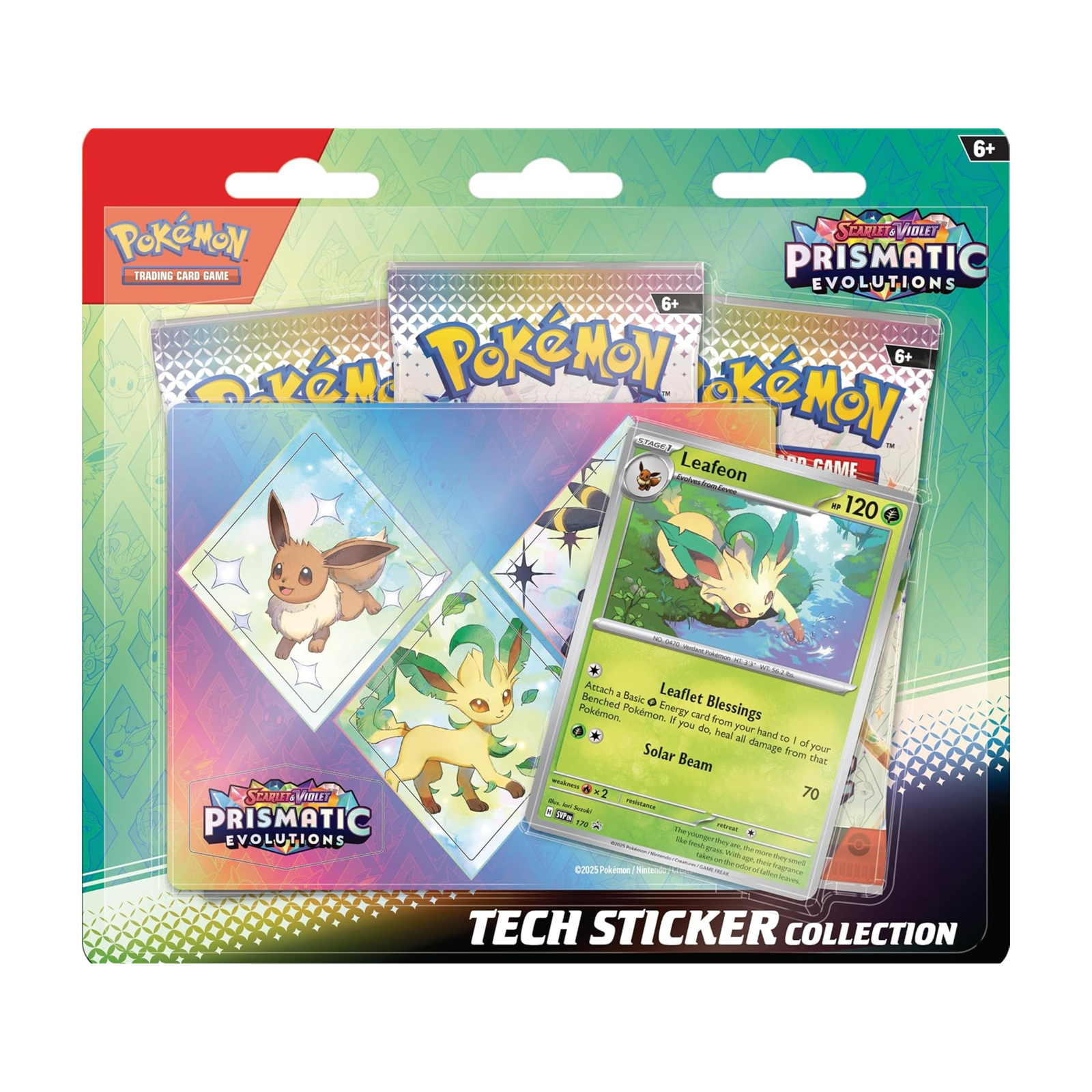 1. What makes the Pokémon Scarlet & Violet: Prismatic Evolutions Tech Sticker Collection special? This limited-edition collection includes exclusive Pokémon TCG stickers, a rare Sylveon, Leafeon, Glaceon promo card, and three Prismatic Evolutions booster packs—a must-have for collectors and Pokémon fans.