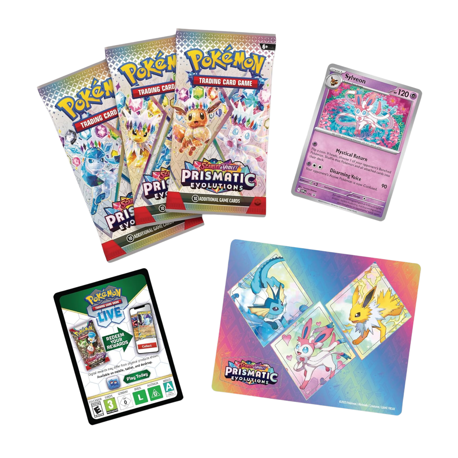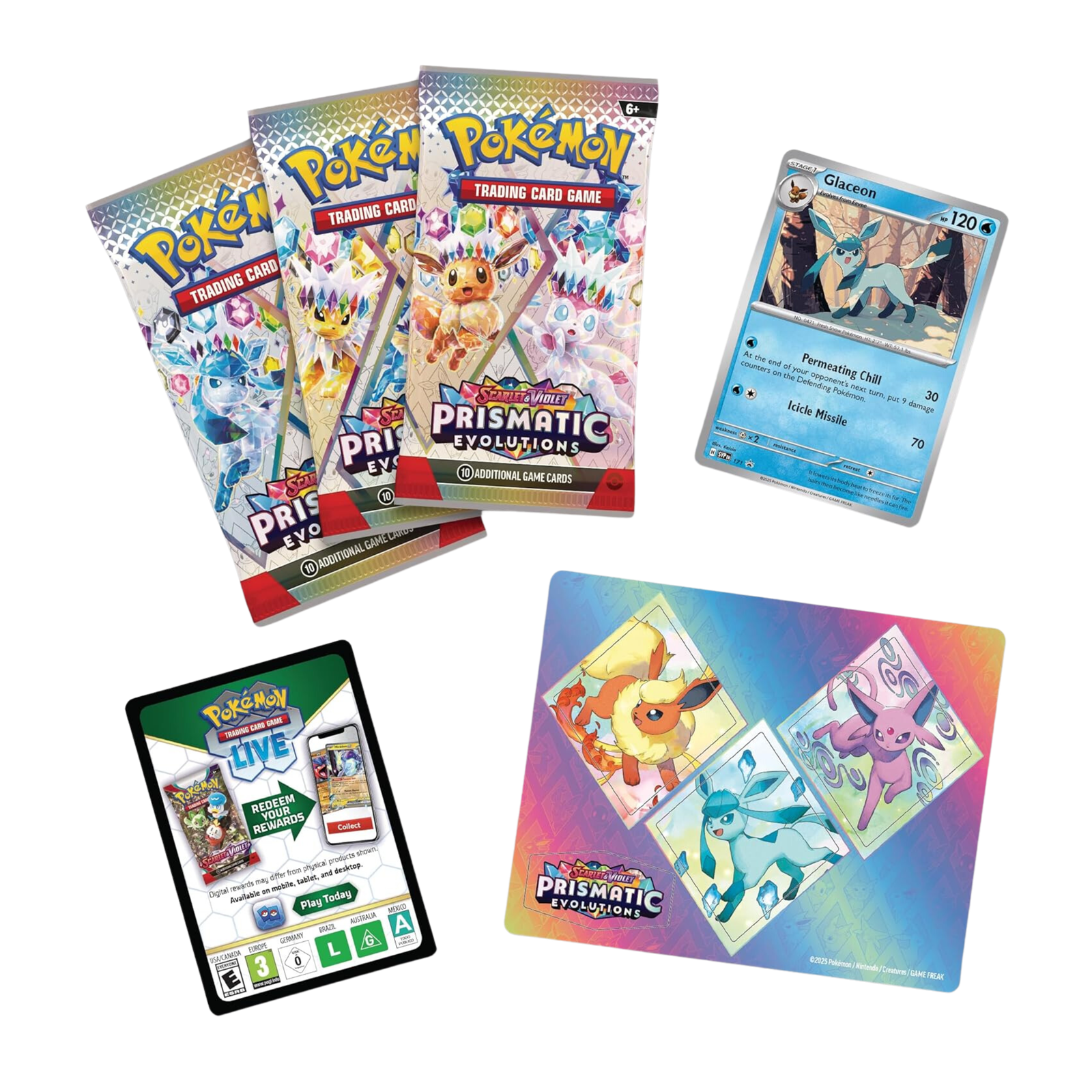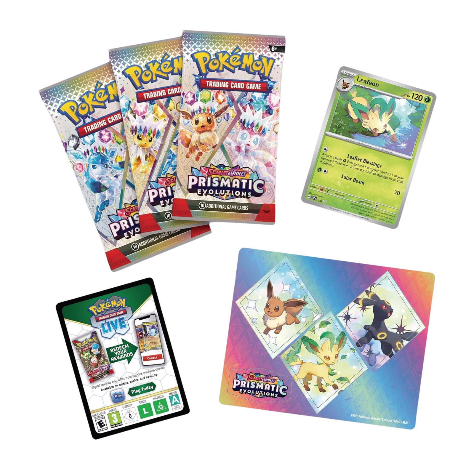 1. What makes the Pokémon Scarlet & Violet: Prismatic Evolutions Tech Sticker Collection special? This limited-edition collection includes exclusive Pokémon TCG stickers, a rare Sylveon, Leafeon, Glaceon promo card, and three Prismatic Evolutions booster packs—a must-have for collectors and Pokémon fans.