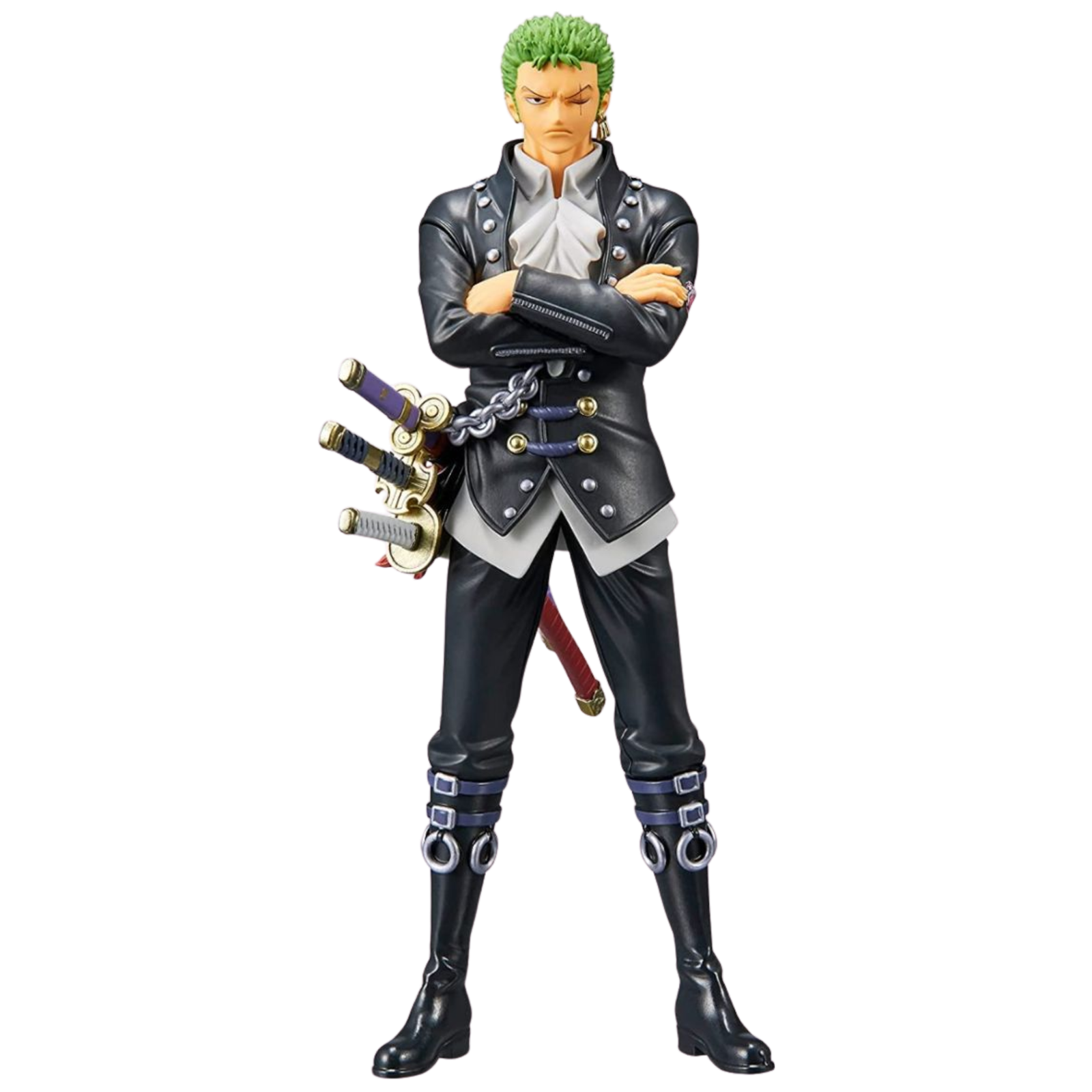 The figure stands approximately 17 cm tall and is expertly modeled in Banpresto’s signature PVC and ABS materials. From the defined muscle sculpt on his arms to the subtle folds in his coat, every aspect of the figure is a testament to Banpresto’s attention to detail. The use of color shading adds depth and realism to Zoro’s attire, particularly the blend of greens and blacks that make up his Film Red costume.