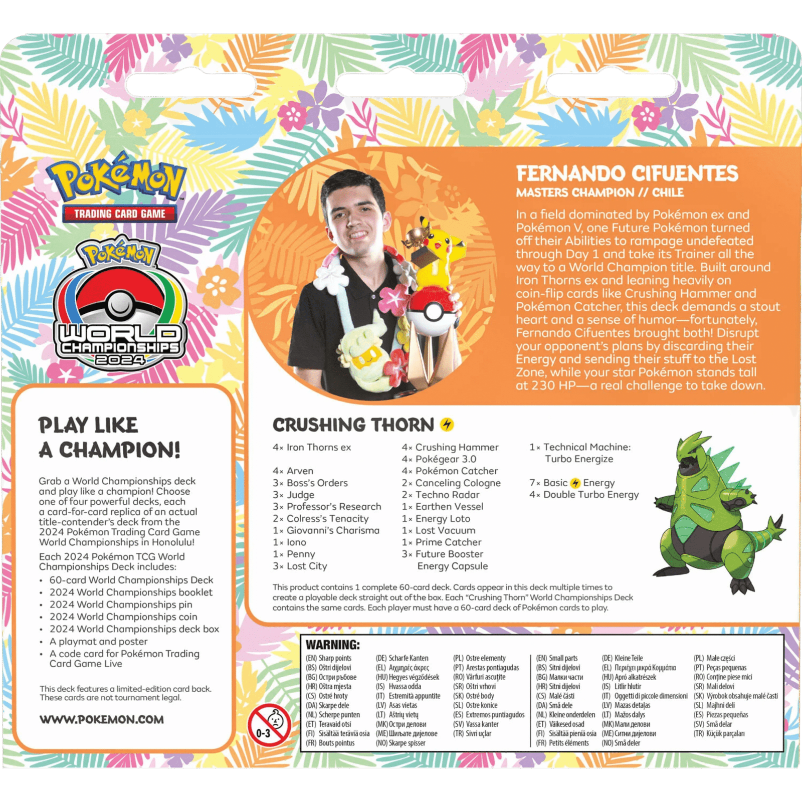 Step into the world of elite Pokémon TCG play with the official 2024 World Championships Deck – Iron Thorns, used by Fernando Cifuentes during the global event in Honolulu. This exclusive product includes a replica of his exact 60-card deck, offering players and collectors a deep look into high-level strategy and synergy.